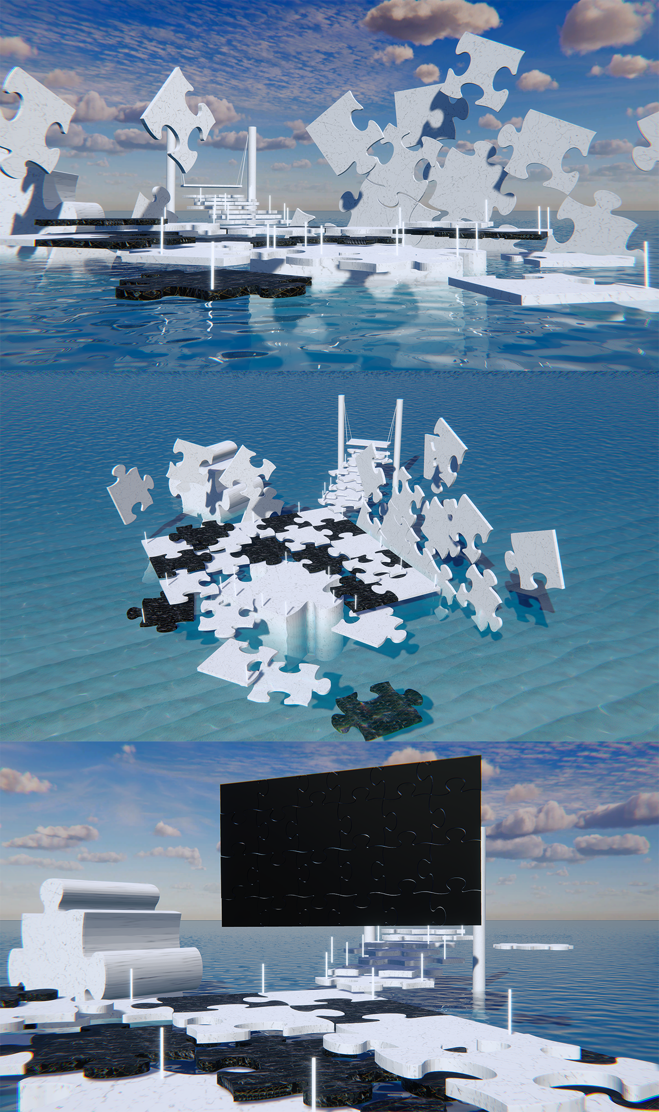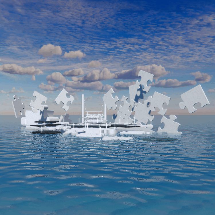 바다 한 가운데 퍼즐로 이루어진 공간 컨셉의 3D배경 입니다.