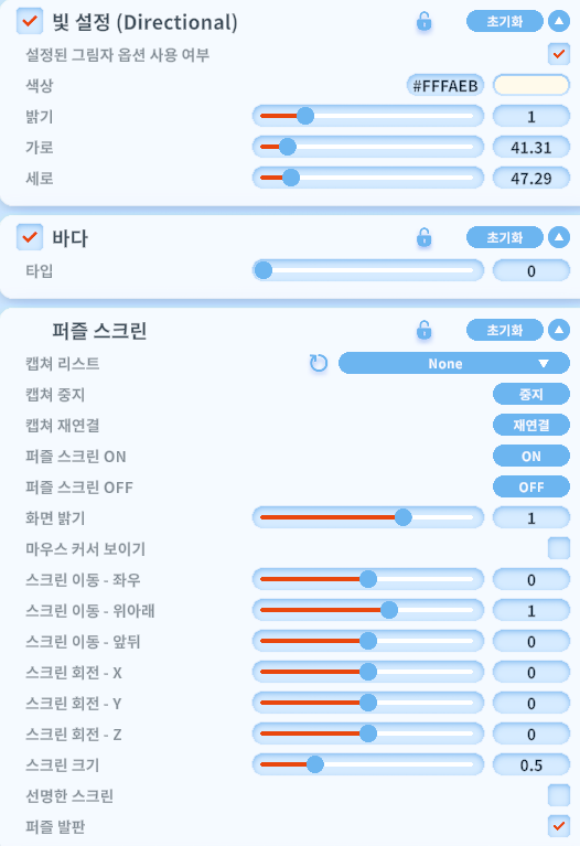 조절 옵션 내에 퍼즐 스크린 ON/OFF를 통해 스크린 기능을 이용할 수 있습니다.