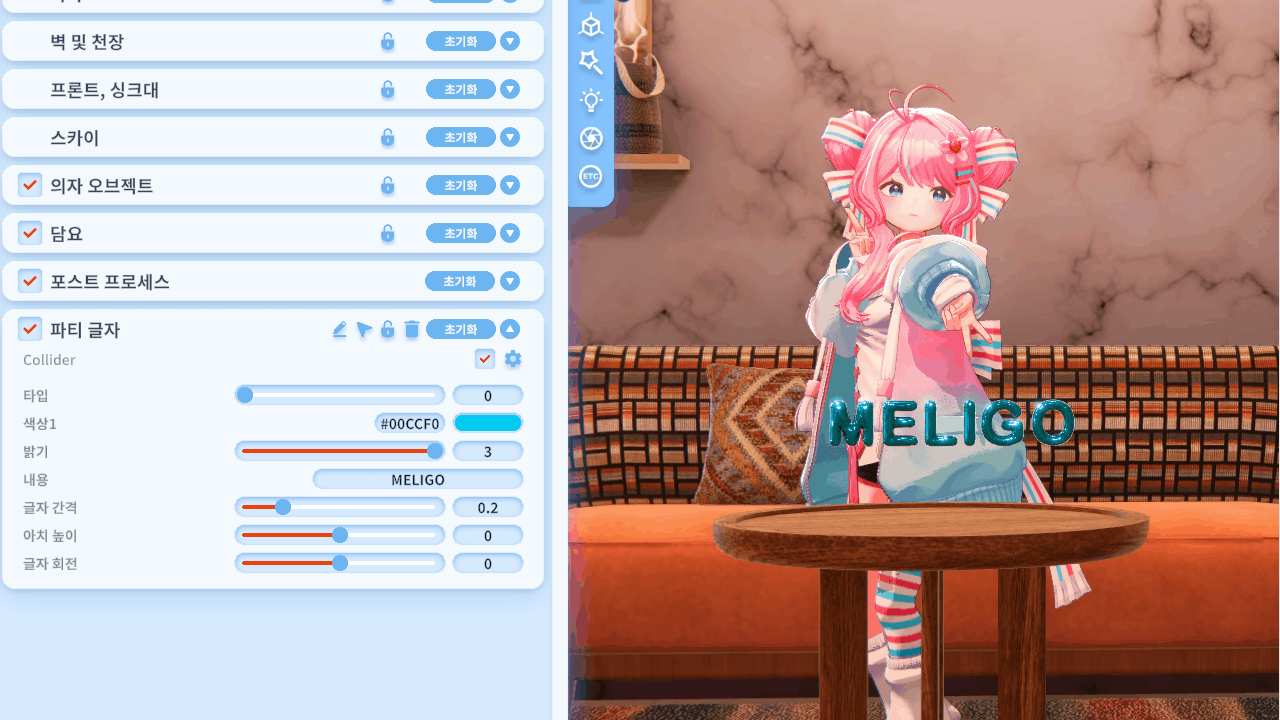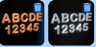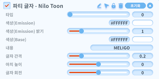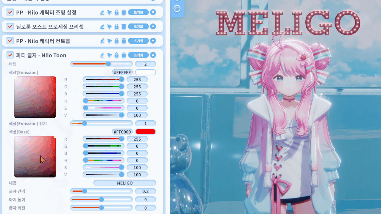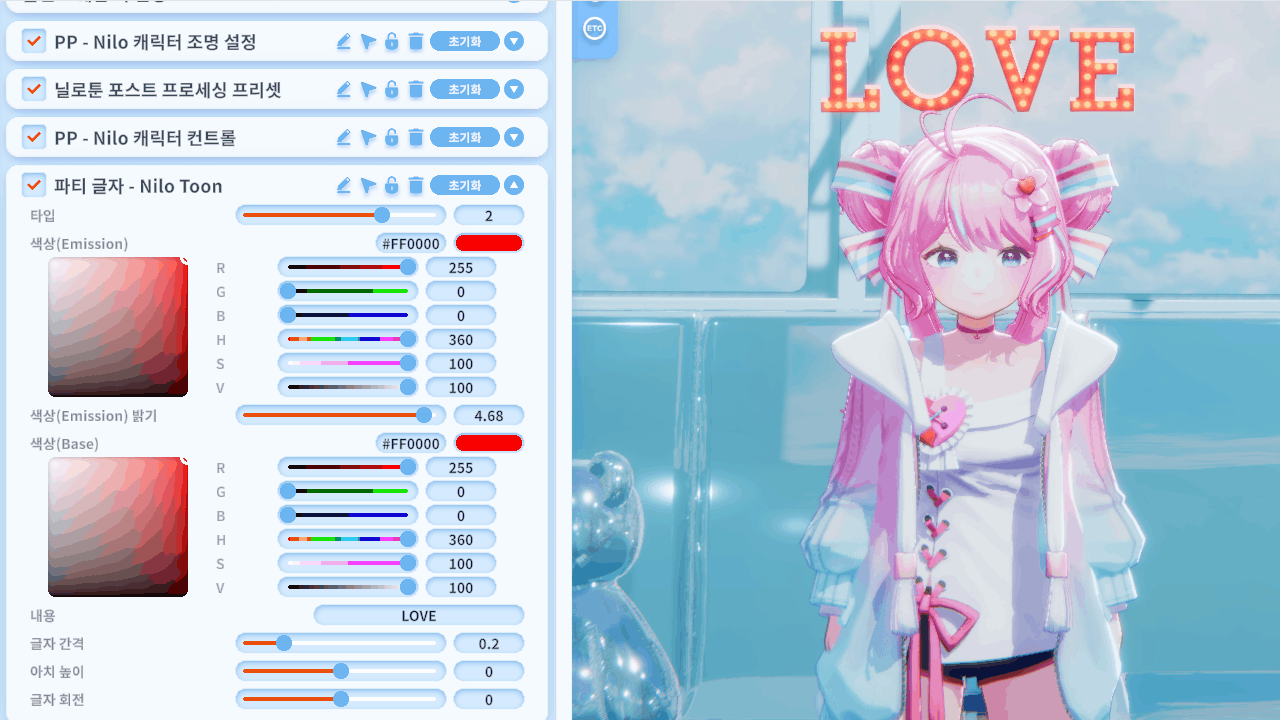 4가지 타입으로 변경 가능하며, 색상 변경, 발광효과(Emission), 글자 간격, 글자 아치, 회전이 가능합니다.
